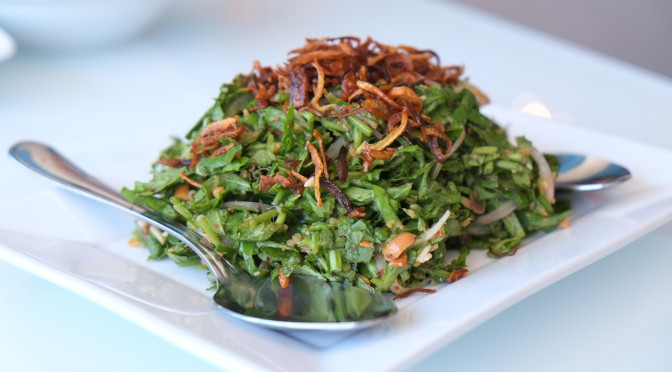 Pennywort Salad with shrimp powder, bean powder, onions, lemon juice and fish sauce. It was a bit like eating chopped-up cilantro with leaves and stems but with the taste of romaine lettuce with a hint of grassiness. Wicca’s enjoyed pennywort drinks in the past but this was our first time eating pennywort salad. She loved it while I thought it was missing a little something.