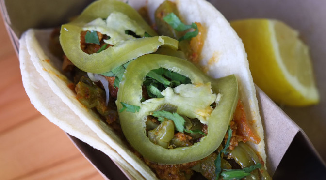 Rajas con Crema taco, which contains roasted poblano peppers, creamed corn and pea tips. The pickled jalapenos on top weren’t that spicy, so shouldn’t concern the spice-averse. Note the double-tortilla. I struggled a bit to taste the roasted poblano peppers in this one. It somehow wasn’t as satisfying as La Taqueria’s creamed corn taco.