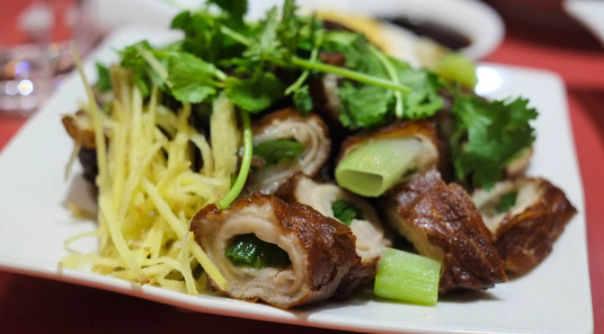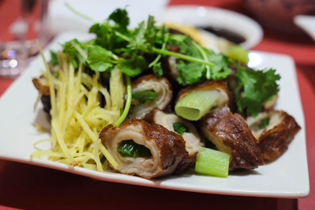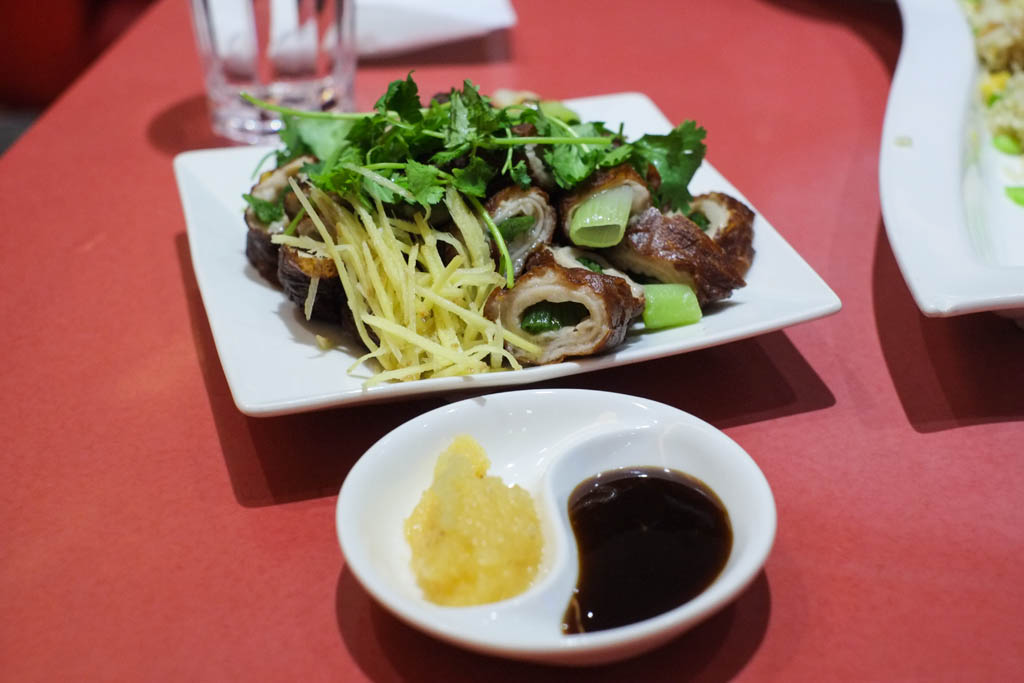 They went to the trouble of stuffing the intestines with green onion, but they didn’t seem to fry these to order because the outside just wasn’t crispy enough, and most of our food arrived sorta warm, not hot. Tastewise it was underseasoned. The ginger was a good pairing though.