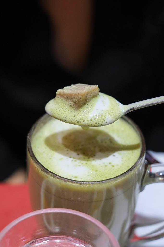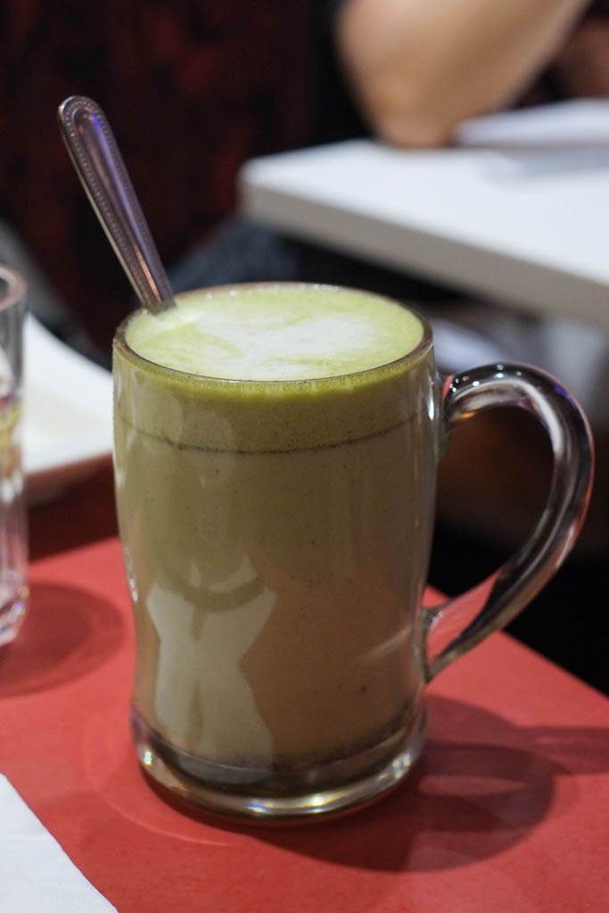 Black Bean Matcha ($6.95), a soy-based drink that Wicca ordered hot. Really strong green tea flavour, and Wicca didn’t sleep a wink all night. The drink incorporates oats somehow, and we’re not sure how “black beans” figure into it. The stuff at the bottom of the glass is: