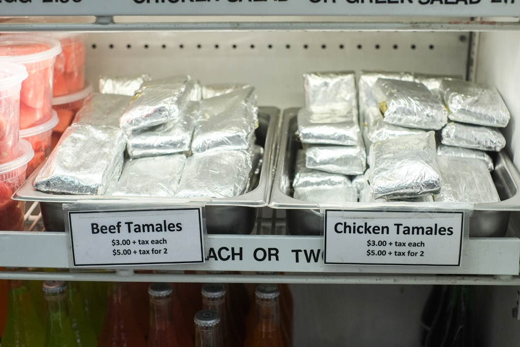 …and tamales! I got a couple of pork & bean pupusas plus a couple chicken tamales to go.