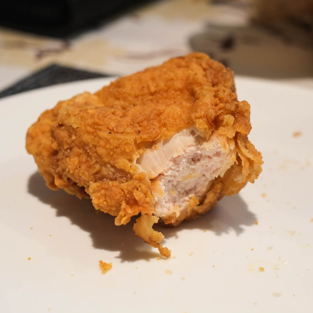 White meat piece was pretty dry. Dark meat pieces were actually moist. The coating stays admirably crunchy. But being pre-made and sitting under heat lamps, this fried chicken has no chance against freshly-fried chicken that you get at Church’s, LA Chicken, Red Rooster, etc. Reminded us a bit of Brownies fried chicken (from the 70s and 80s) and maybe crossed with A&W Chubby Chicken, but with a thin yet crunchy batter. Good for something you can get 24/7.