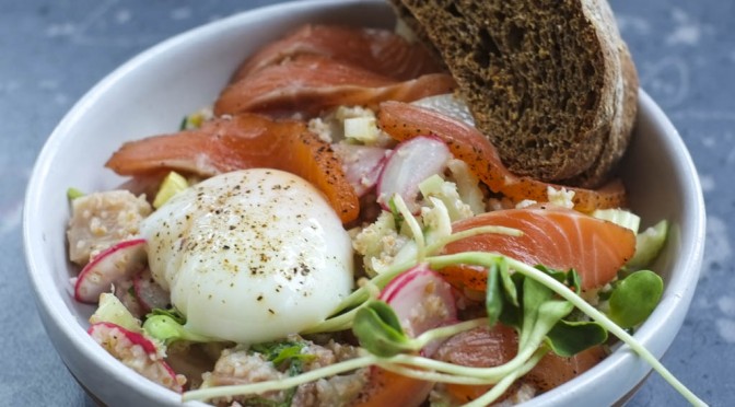 Coffee Cured Trout Lunch Bowl ($9) with beets, bulgur, and mint, with a toast & poached egg add-on ($2). My friend ate this and I declined to have a taste, so you’ll just have to go by looks 😛 The toast looks like a dark rye.