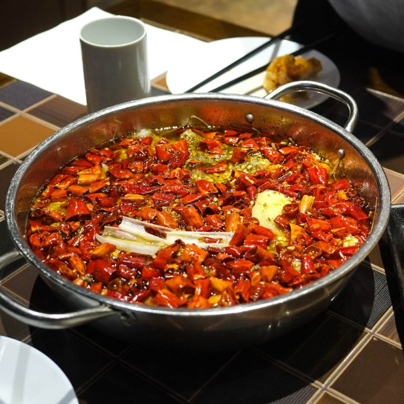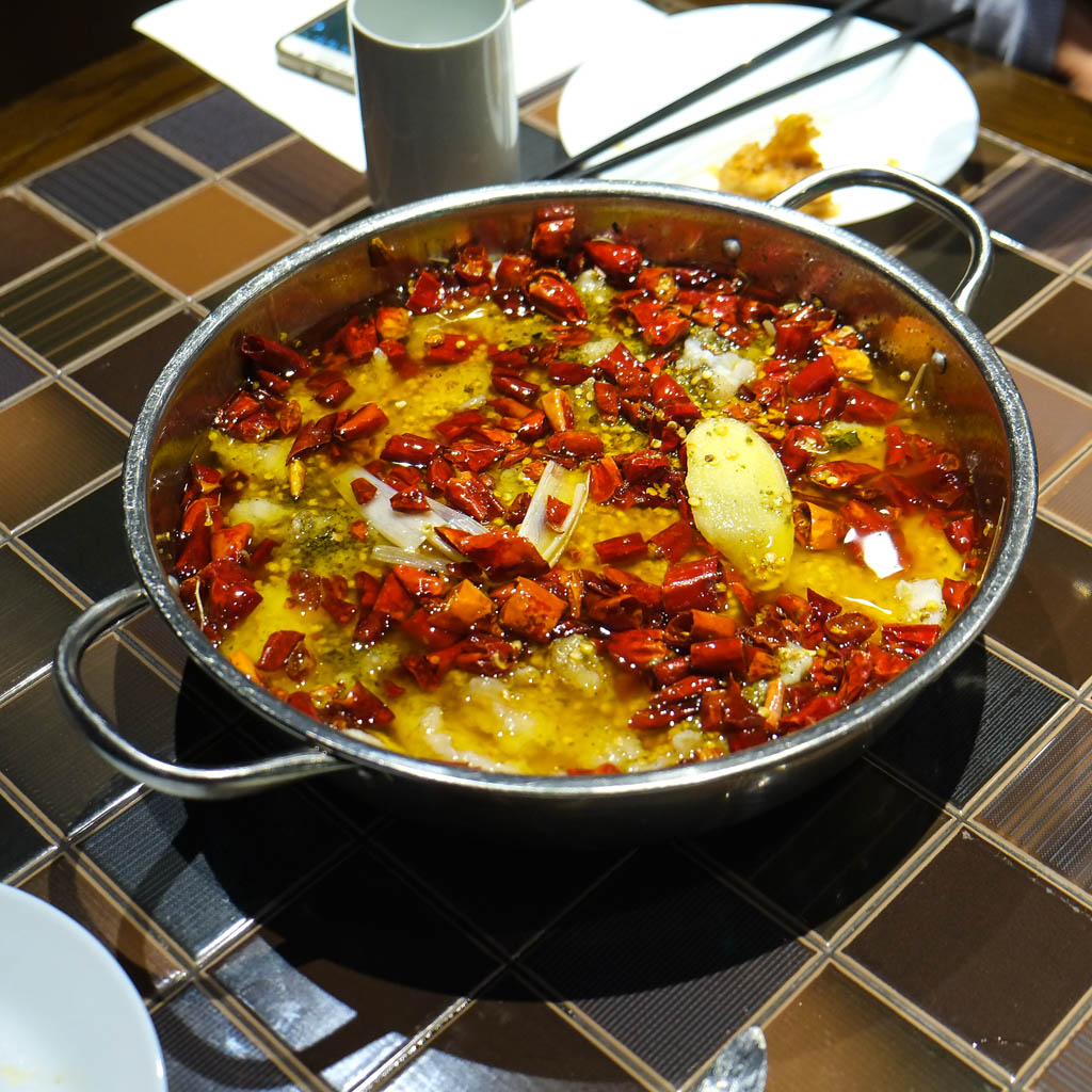 A few moments later, the chef comes out and scoops out most of the chilies. I guess they want it hot, but not too hot! 😀
