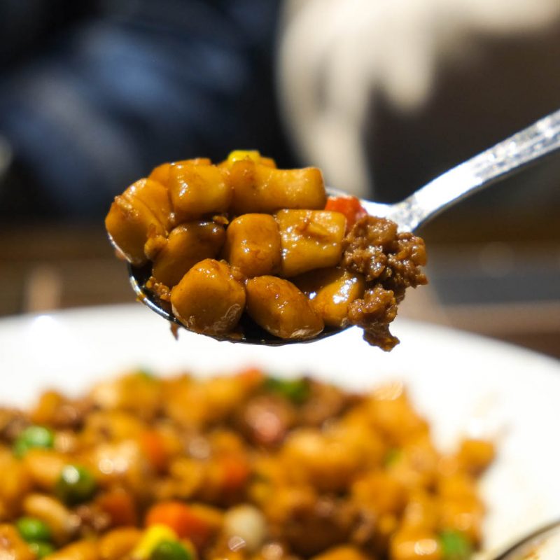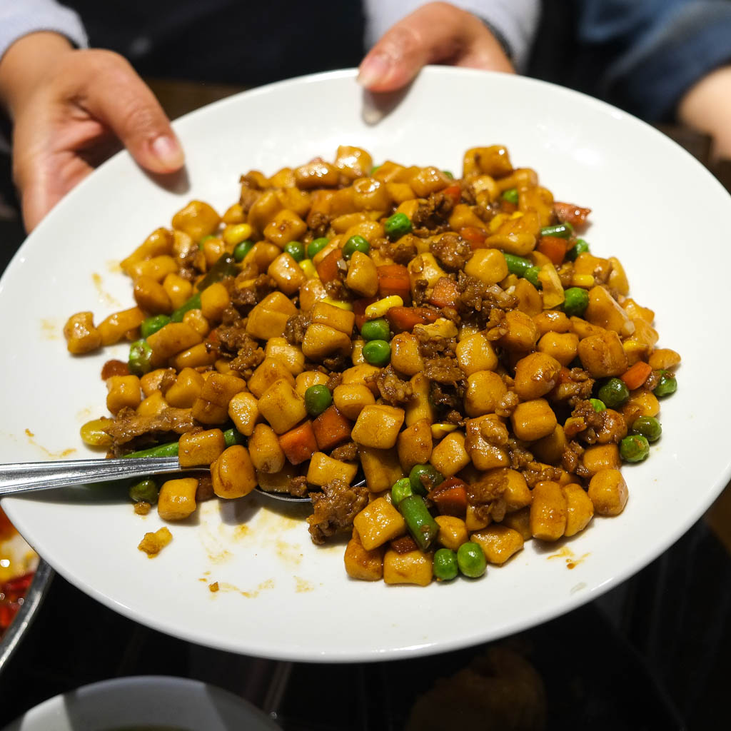This dish looks like giant corn kernels but it’s actually chewy little dumplings with ground pork and mixed veg. Really enjoyable! Savoury with a bit of sweetness from the corn, green beans, and peas. I’d get this again.