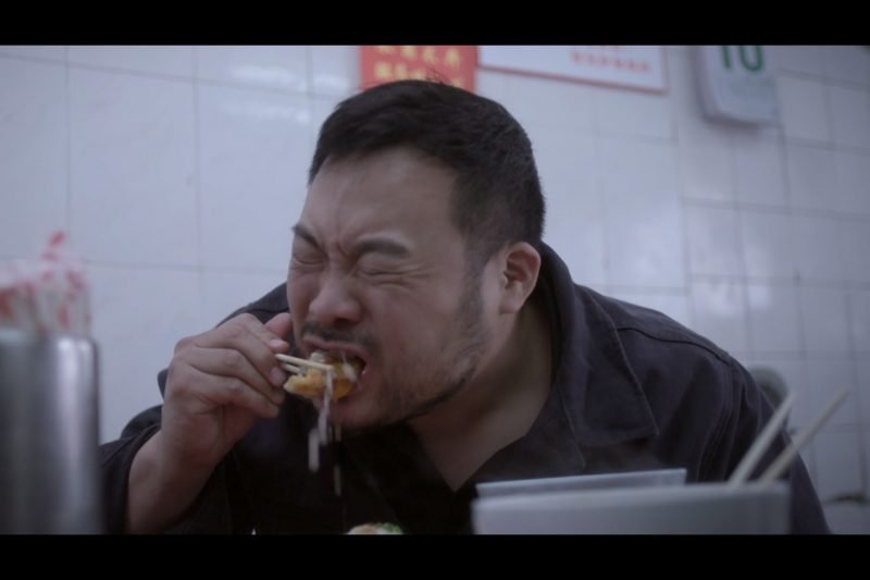 David Chang bites into a hot, soup-filled dumpling in episode 8 of Ugly Delicious.